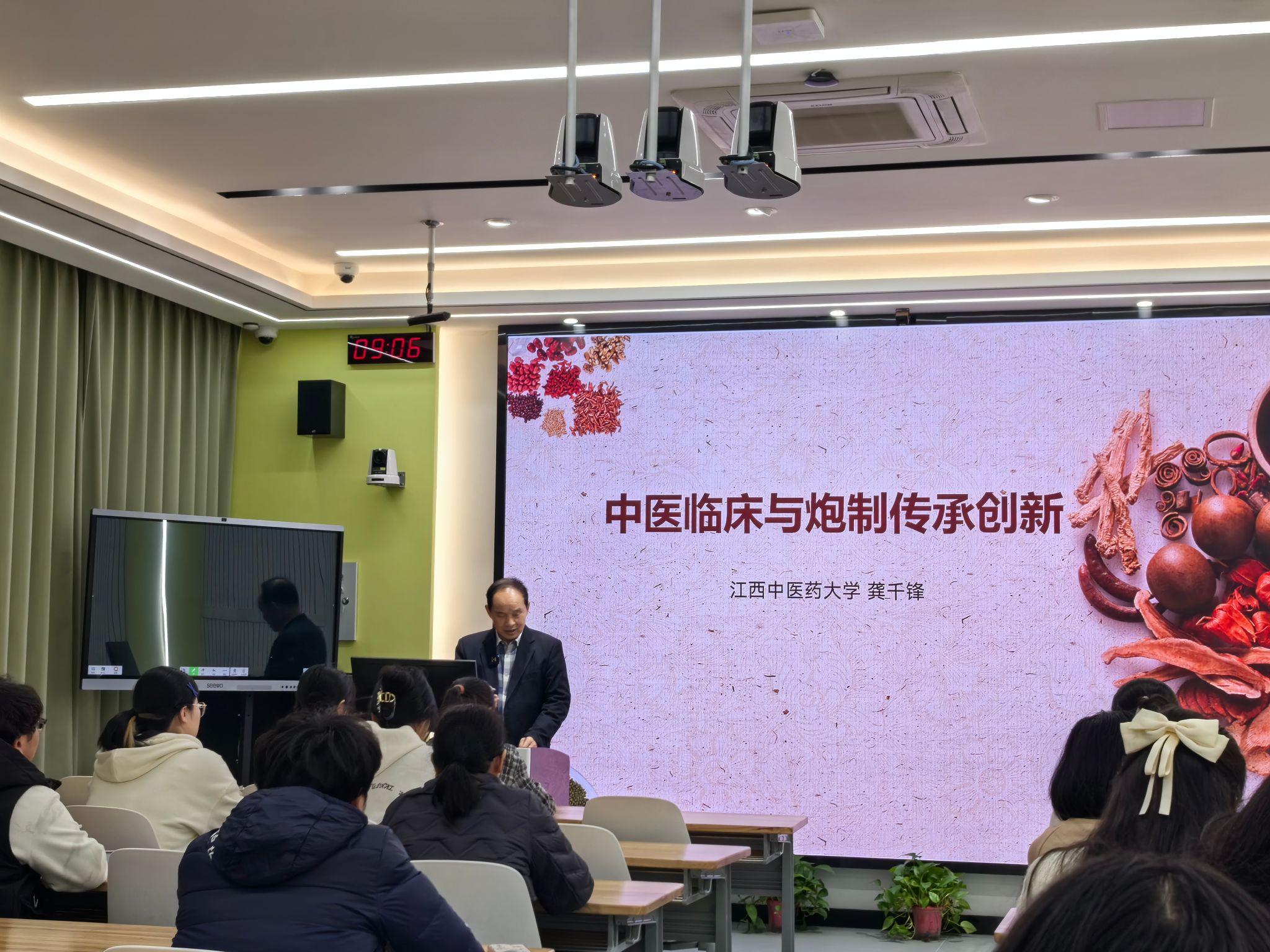 龚教授以习近平总书记“四个自信”中的“文化自信”作为开场序言,讲述了中医药在人民健康事业中发挥着举足轻重的作用,其中中药炮制传承与创新作为非遗文化更是凸显中医药文化自信的着力点。接着从“中药为什么要炮制?中药炮制是中医临床用药的特点,中药炮制如何确保中医临床安全、中药炮制如何提高中医临床疗效”等四个方面展开讲座内容,围绕江西樟树药帮文化、樟树药俗,以故事演绎的方式,将个人从医六十余年来在中医临床、中药炮制学科建设、中药炮制学国家级团队六代传承之秘等经验娓娓道来,他强调中药炮制是中药与临床的桥梁,也是保证中医临床疗效的关键环节,并亲授十六字养生诀,希望同学们在今后的学习生活中要保持身心健康,更好的服务于中医药健康事业。